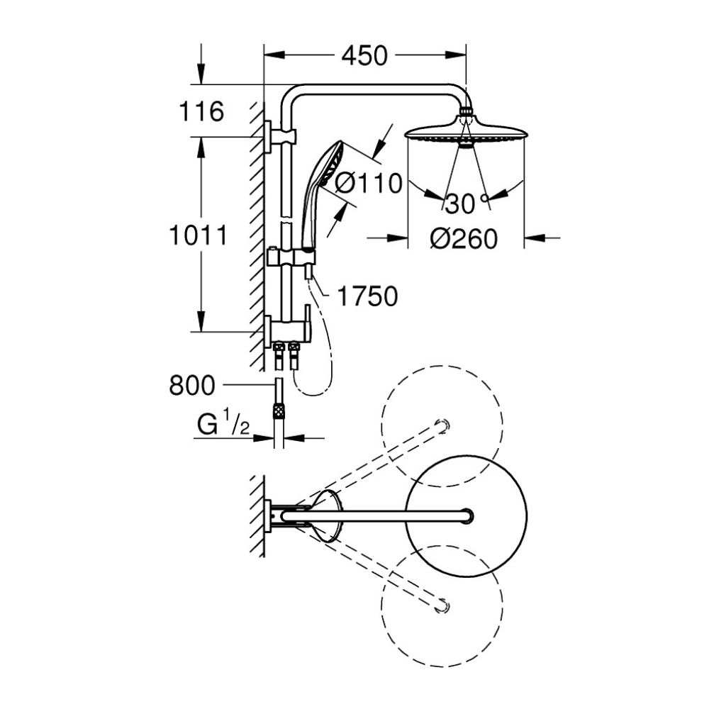Caractéristiques de la Colonne de douche avec inverseur Grohe Vitalio Joy System 260, chrome (27357002) :