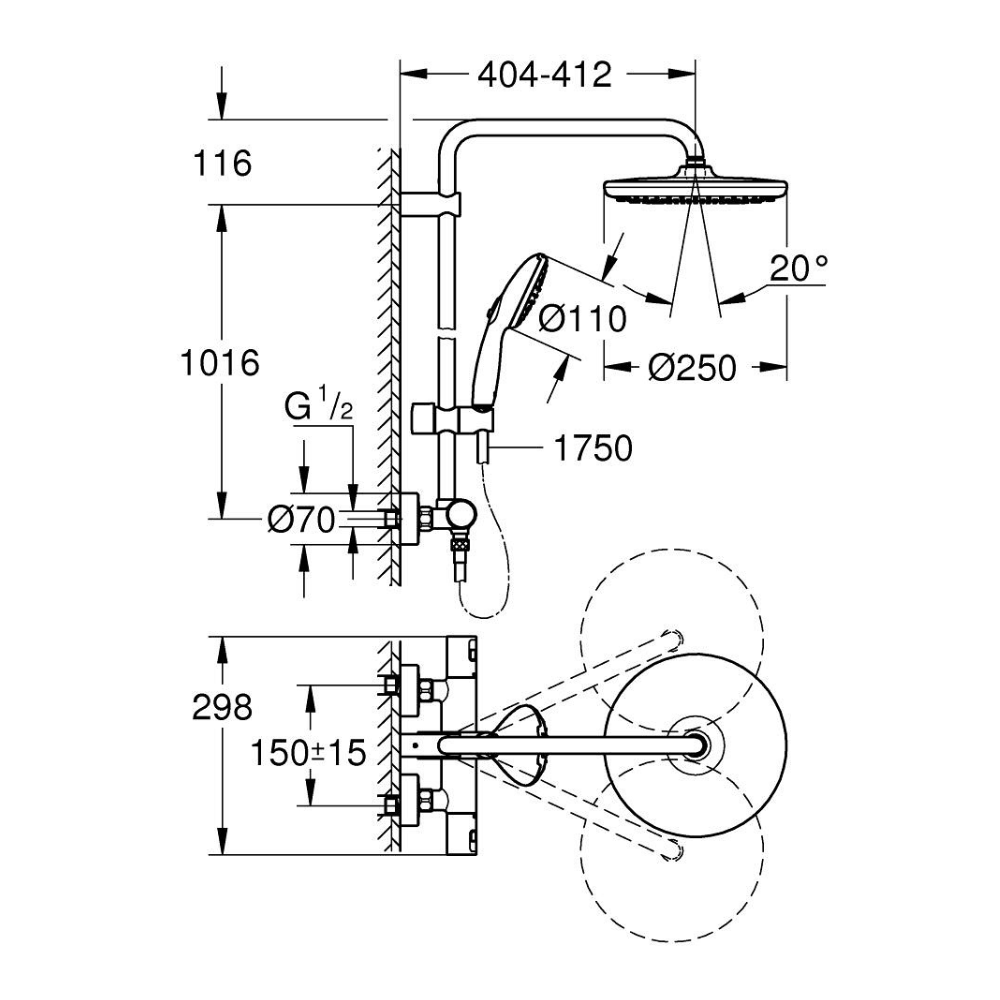 Caractéristiques de la colonne de douche avec mitigeur thermostatique + Douche de tête + Douchette 2 jets, chrome (G26677001) Grohe Vitalio Start System 250 (G26677001) :