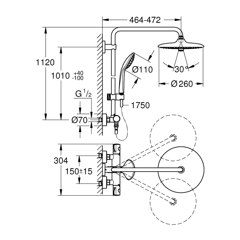Caractéristiques de la colonne de douche avec mitigeur thermostatique Grohe Vitalio Joy System 260, noir/chrome (G26838KI0) :