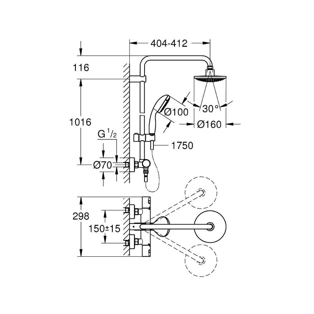 Grohe Vitalio Start System 160 Colonne de douche avec mitigeur thermostatique + douche de tête + douchette à main, chrome (G26832000)