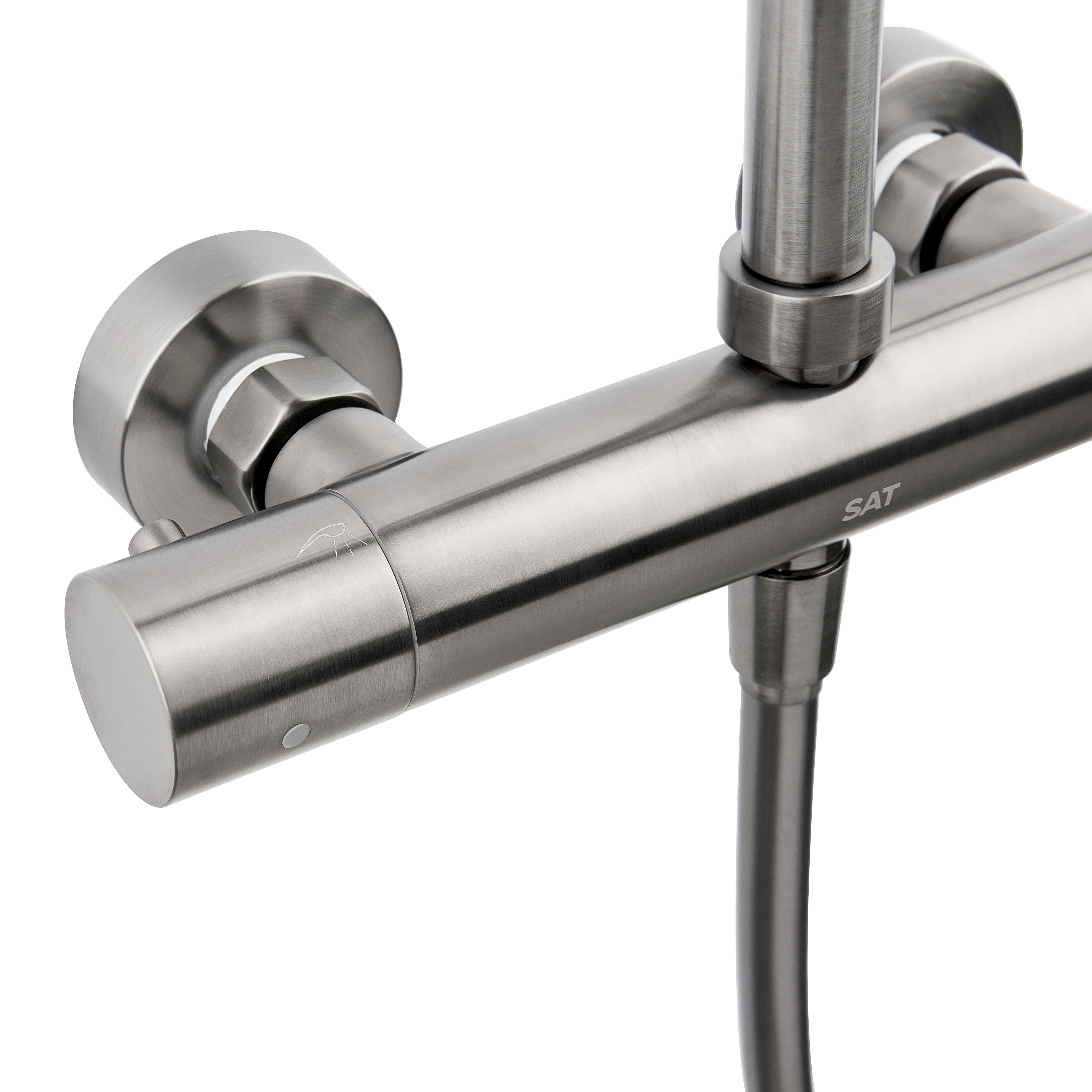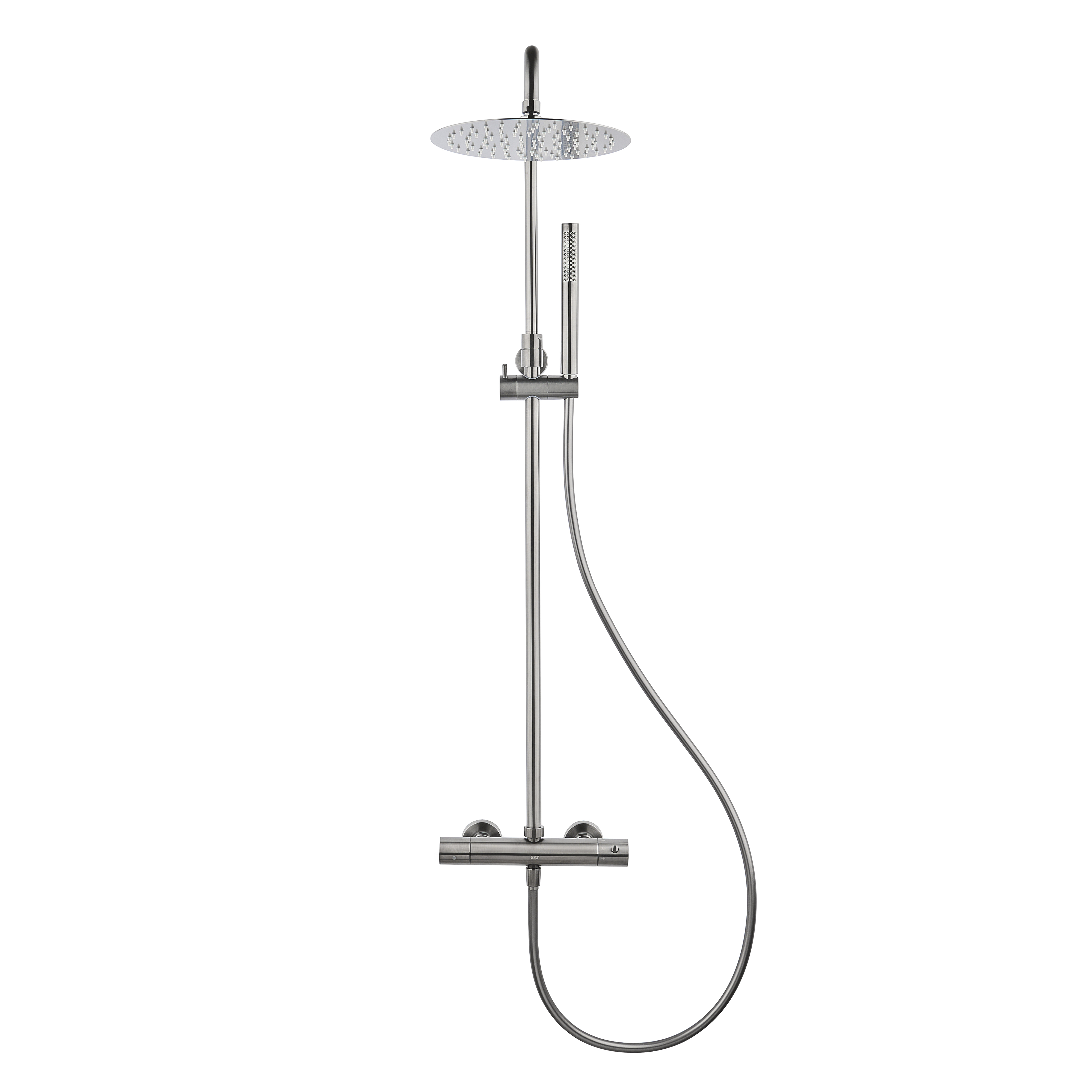 Caractéristiques de la colonne de douche 2 jets avec mitigeur thermostatique + douche de tête + douchette à main 2 jets, Swiss Aqua Technologies (SAT) Aurum, métal brossé (SATSSTKAURBGM) :