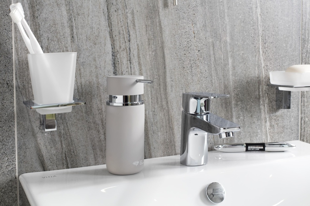 Ce distributeur de savon liquide en finition gris mat apportera à votre salle de bain de la modernité grâce à son design minimaliste et coloré.