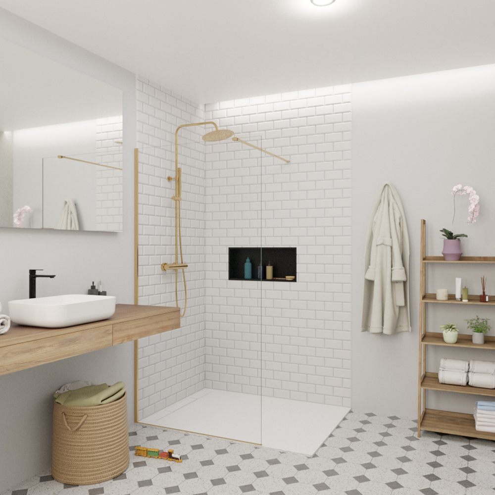 Caractéristiques de la paroi de douche Walk-In anticalcaire avec profilés et bras couleur Laiton (SATBWI90PRMO) :