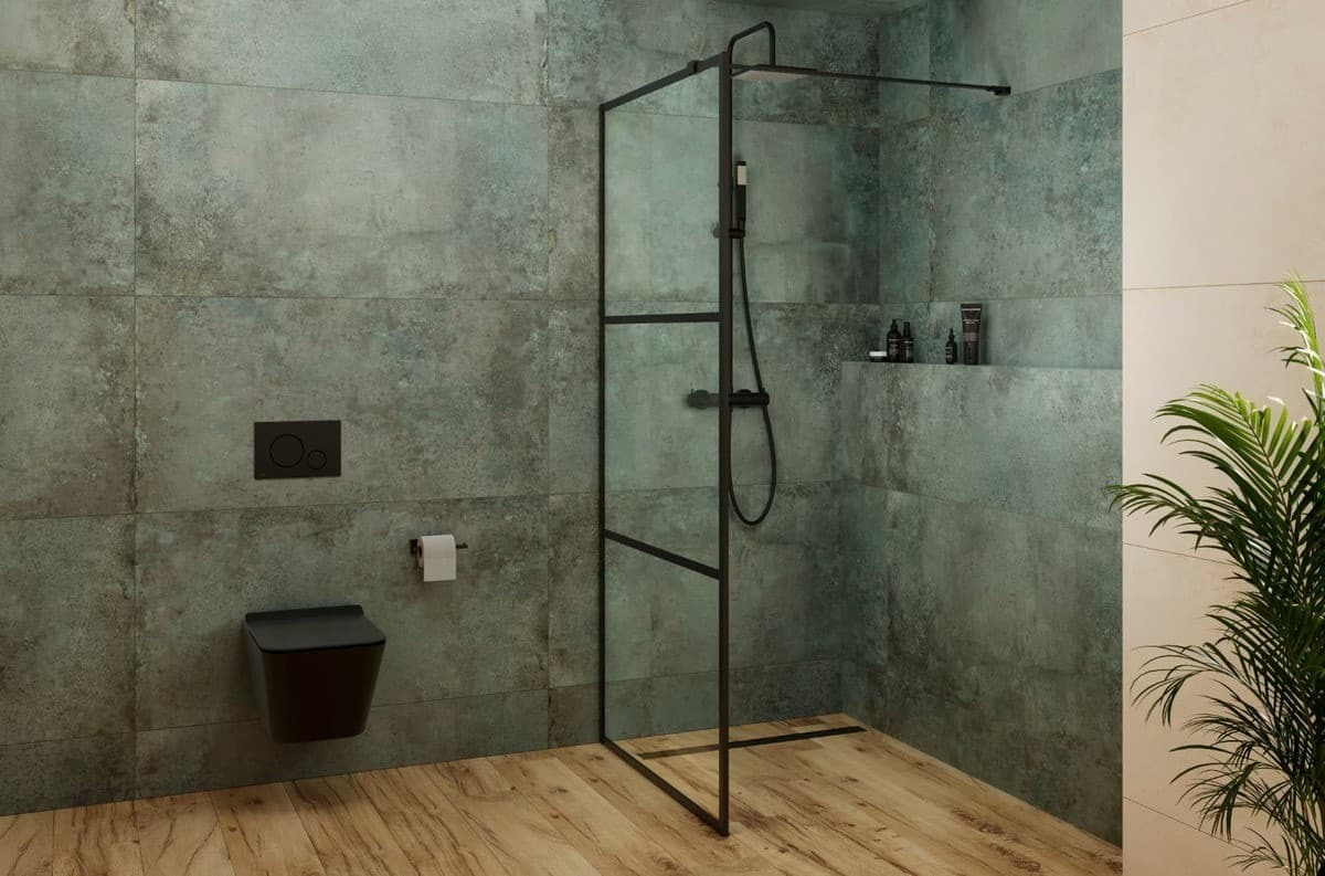 Caractéristiques de la paroi de douche Walk-In anticalcalcaire sérigraphié avec profilés et bras noir mat (SATBWI100CPPRC) :