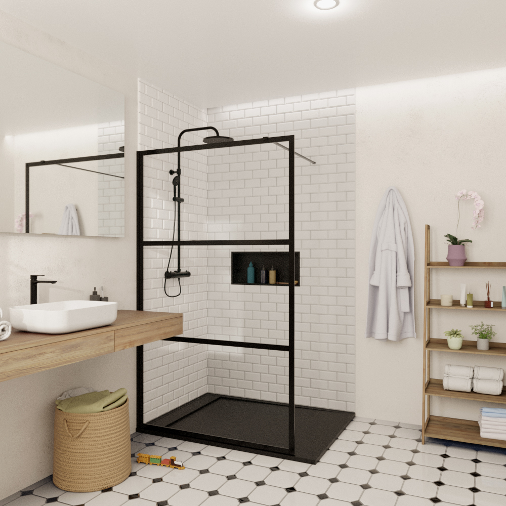 Caractéristiques de la paroi de douche Walk-In anticalcalcaire sérigraphié avec profilés et bras noir mat (SATBWI120CPPRC) :