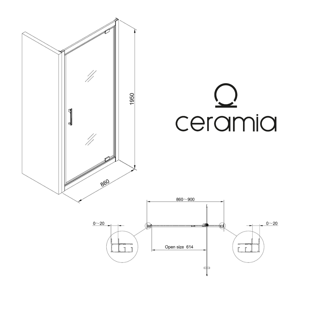 Caractéristiques de la Porte de douche ZENITH 90x195cm pivotante avec profilés Noir mat (CERAHZ90B) :