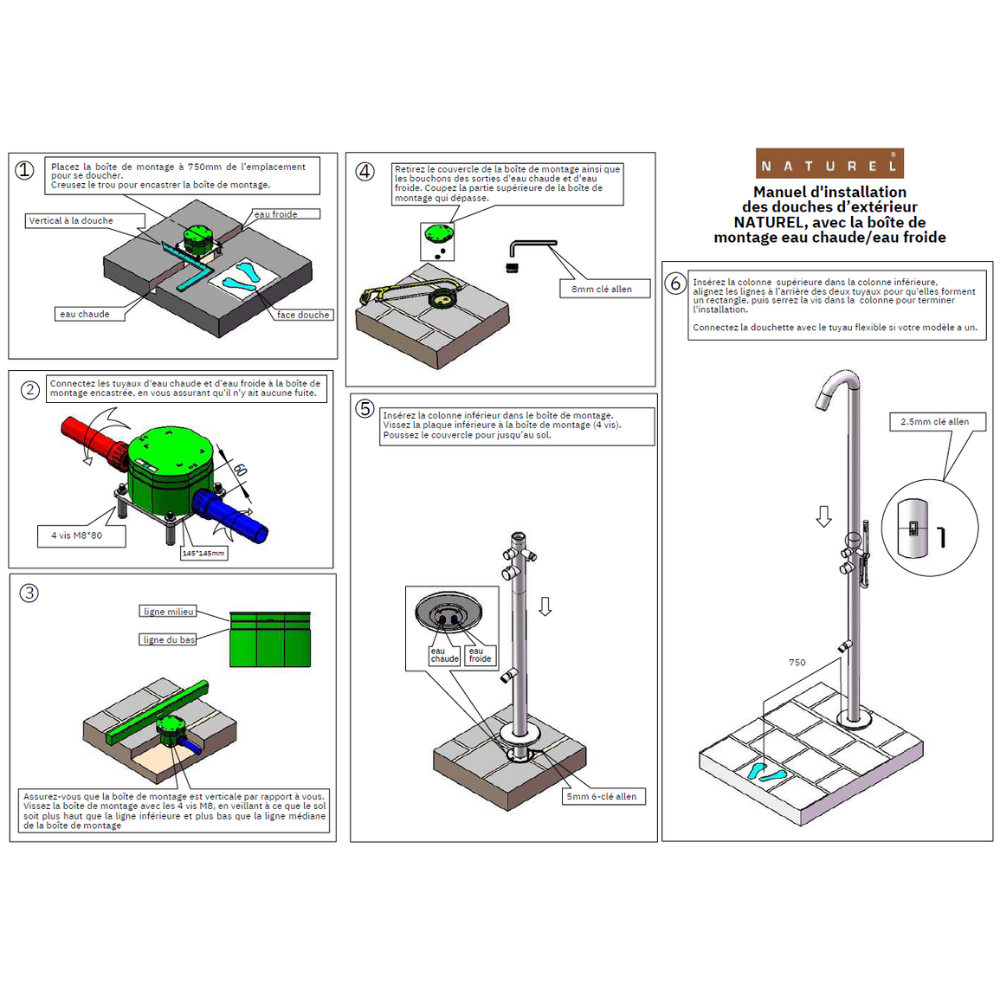 Le montage est simplifié grâce à une boîte brevetée pour un raccordement facile à l'eau chaude et froide. La douchette pour se laver ou se rincer les pieds avant de plonger dans la piscine est bien pratique.