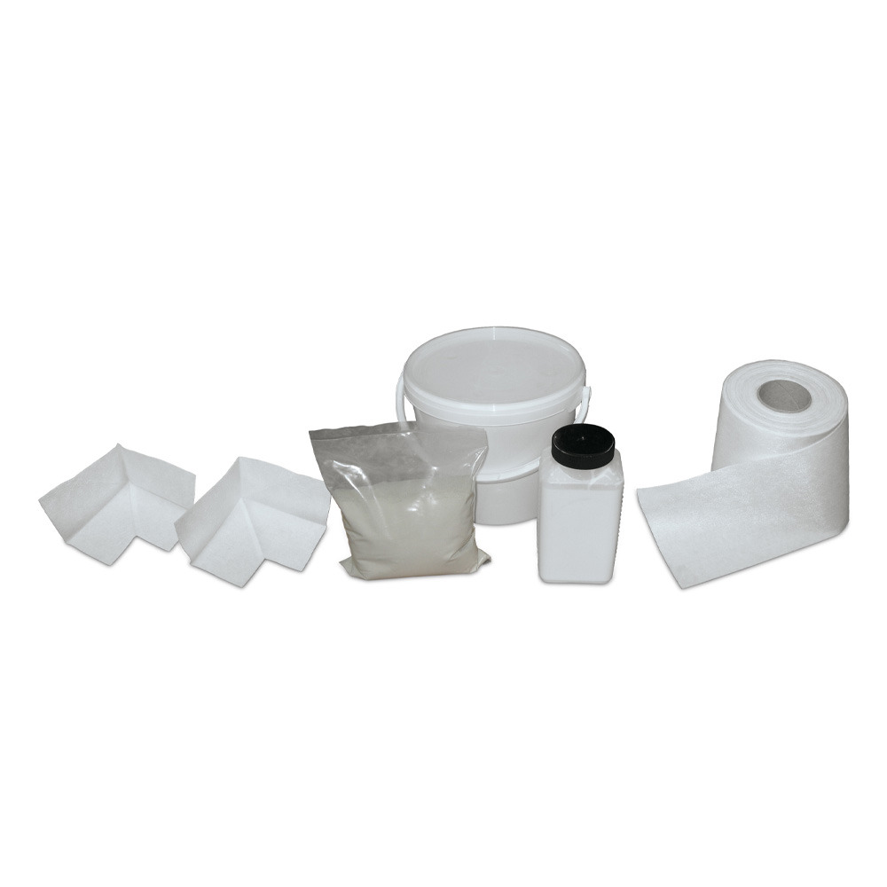 - Kit d’étanchéité composé d’une bande d’étanchéité de 10 m, 2 angles, une poudre et un liquide à mélanger pour le collage