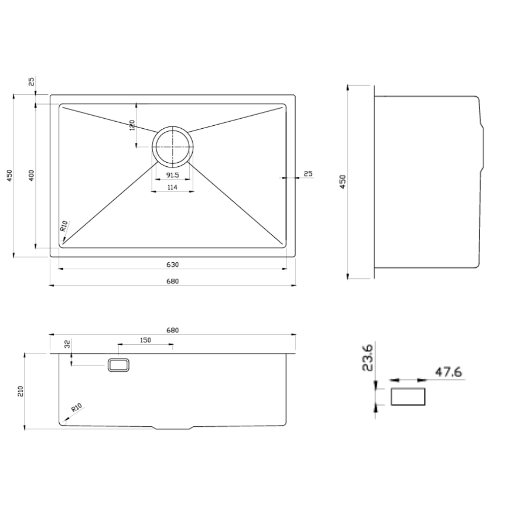 Caractéristiques de l'évier en acier inoxydable, 68x45x21 cm, métal Swiss Aqua Technologies Aurum (SATSINK6845BGMU) :