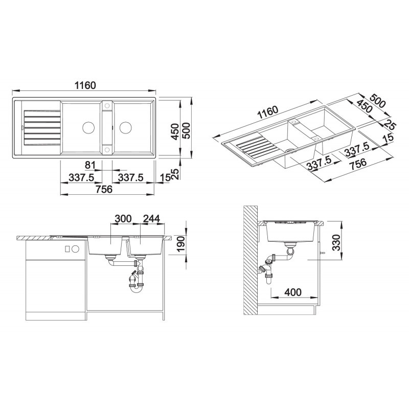 - Taille de l'évier: 1160 x 500 mm