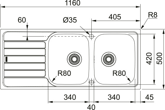 Caractéristiques de l'Evier 116x50cm avec double cuve et égouttoir à gauche, Acier inoxydable, Franke Smart SRX 621 (101.0356.896) :
