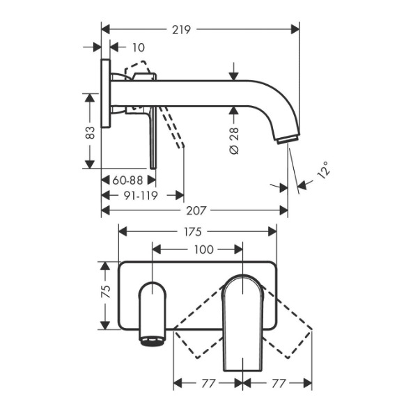 Caractéristiques du Mitigeur de lavabo encastré mural, 2 sorties, bec 207 mm, Chrome, Hansgrohe Vernis Shape (71578000) :