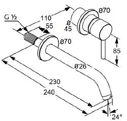 La rosace de 70 mm de diamètre et la saillie murale de 230 mm ajoutent une esthétique sophistiquée à l'ensemble. Pour une installation parfaite, n'oubliez pas d'acheter le corps d'encastrement référence 38243, vendu séparément.