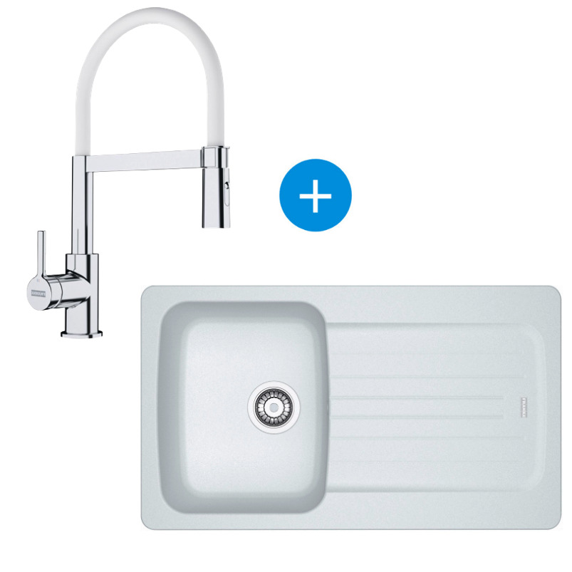Franke Aveta Evier 86x50cm avec égouttoir réversible Fradura, Blanc + Mitigeur cuisine semi-pro, douchette extractible, Chrome/Blanc