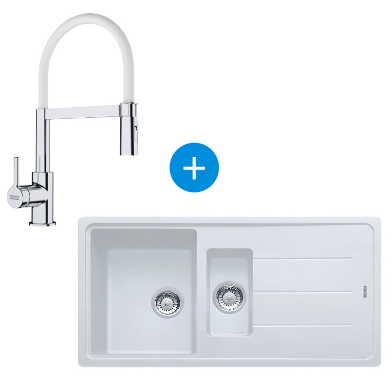 Franke Basis Evier 97x50cm avec vide sauce, égouttoir réversible, Fragranit + Mitigeur semi-pro, douchette extractible, Chrome/Blanc