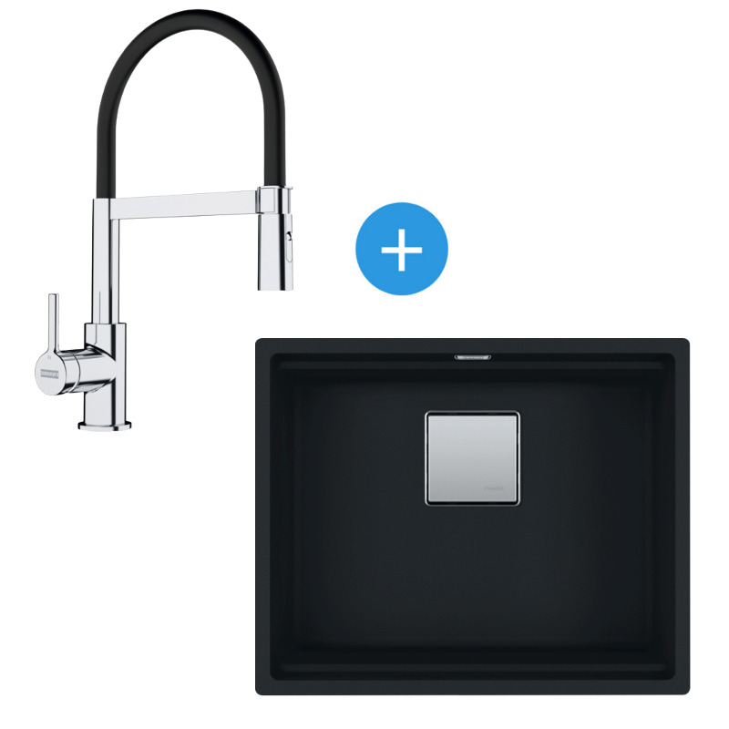 Franke Kubus Evier sous plan 56x46cm Fragranit+, Noir mat + Mitigeur cuisine 205x410mm semi-pro avec douchette extractible, Chrome/Noir