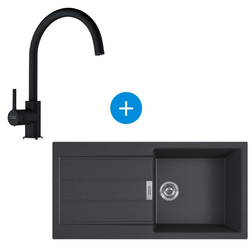 Franke Sirius Evier à encastrer 100×50cm 1 bac avec égouttoir, Tectonite, Onyx + Mitigeur col de cygne, Fragranit, Onyx