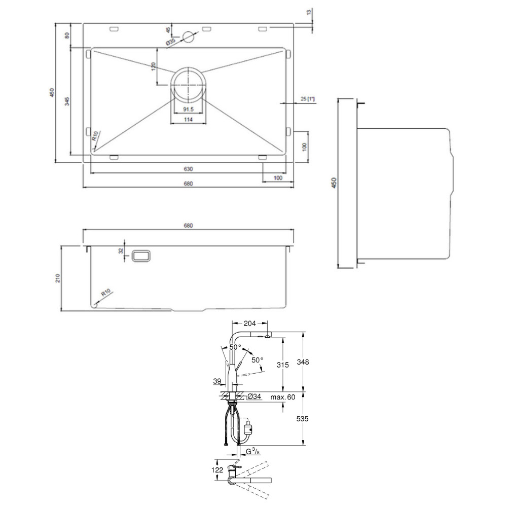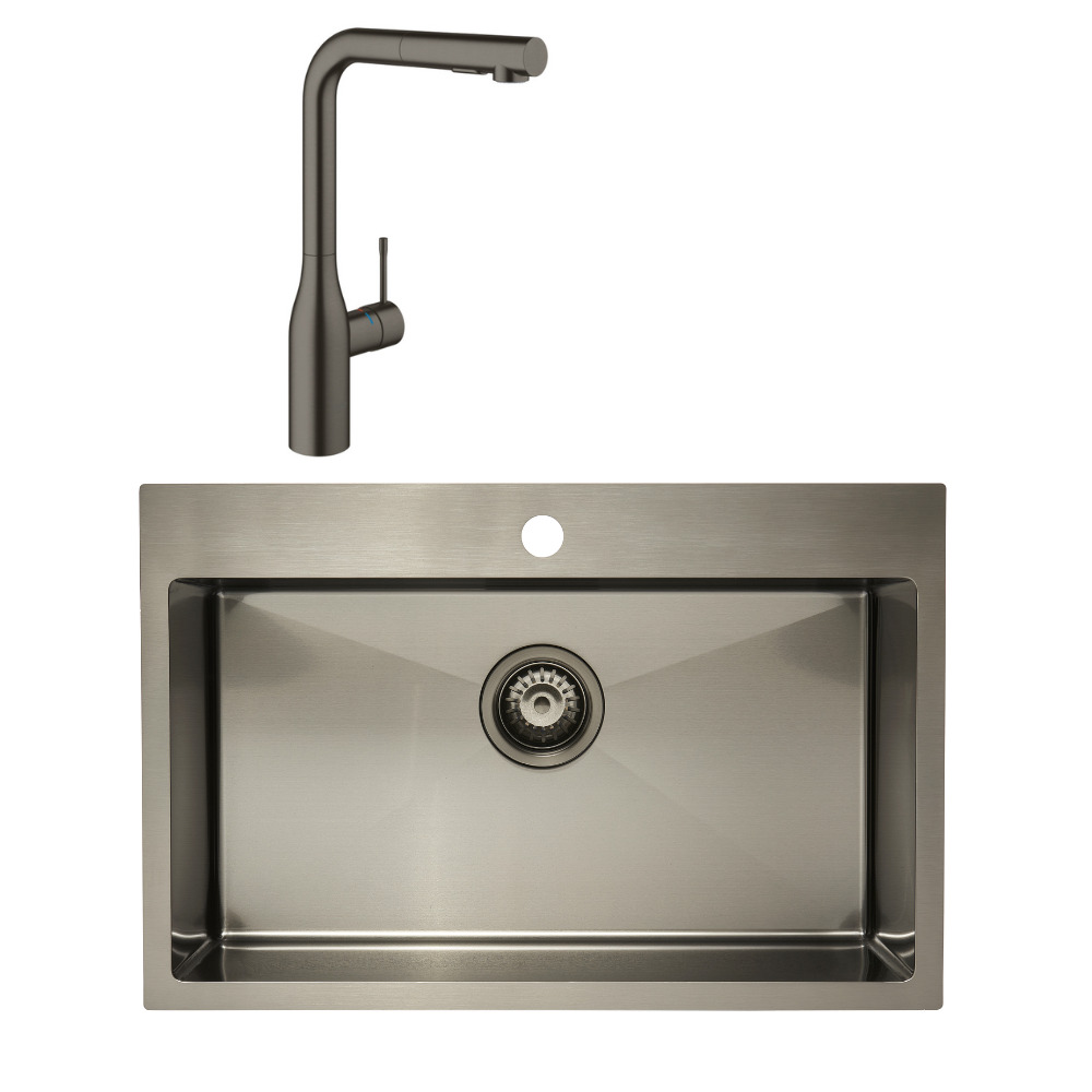 Caractéristiques du Set Aurum Évier de cuisine encastrable inox 304, 68x45x21 cm + Essence Mitigeur monocommande Evier, Gun Metal brossé (SATSINK6845BGM-SET1) :