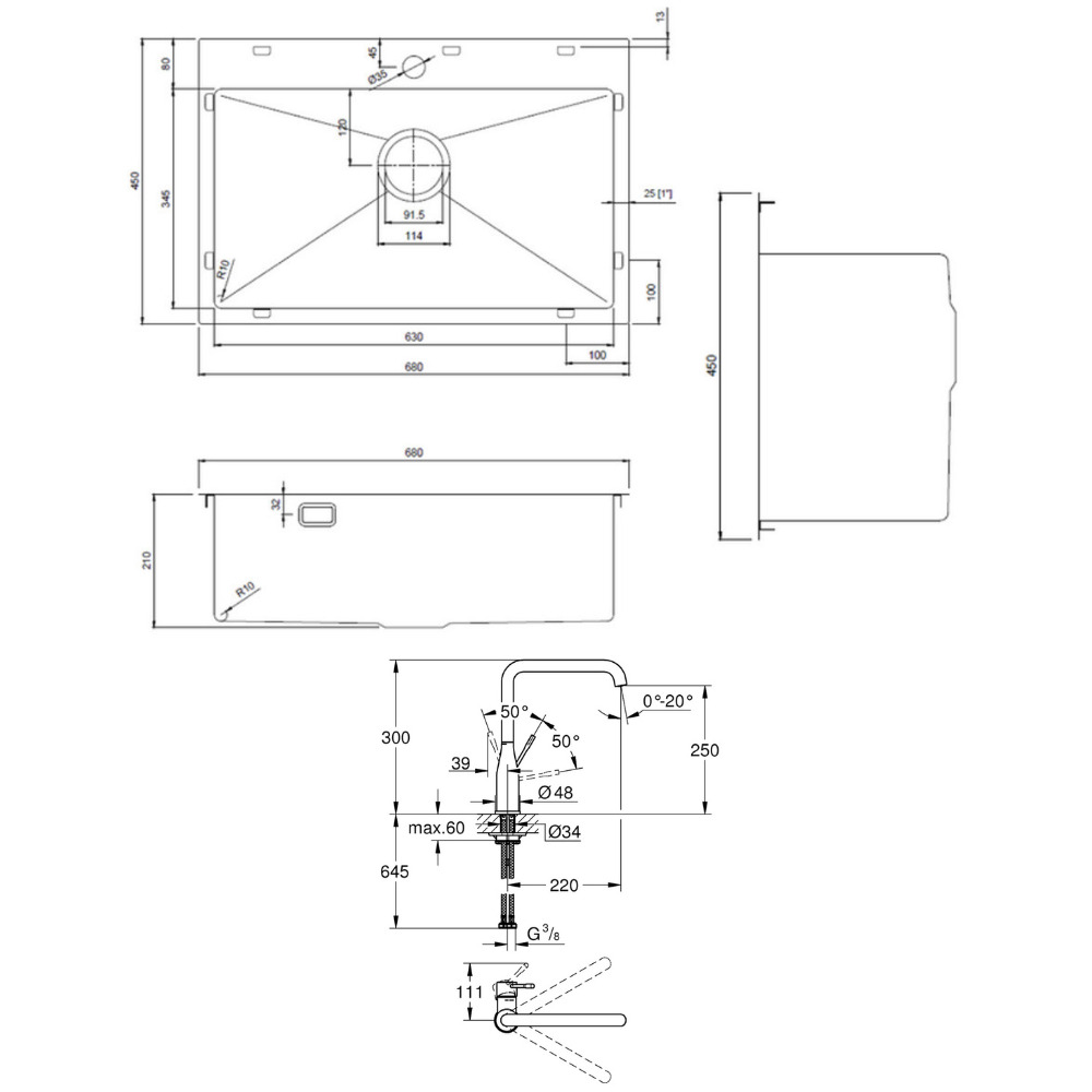 Caractéristiques du Set Aurum Évier de cuisine encastrable inox 304, 68x45x21 cm + Essence Mitigeur monocommande Evier, Gun Metal brossé (SATSINK6845BGM-SET1) :