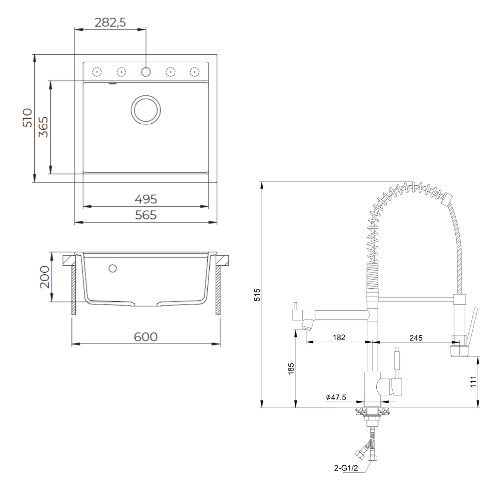 Caractéristiques de l'évier 56,5x51cm en granite à encastrer + mitigeur à bras pivotant, 2 jets, Swiss Aqua Technologies (SAT), jasmin (SATSINKGQQ100J-S2) :