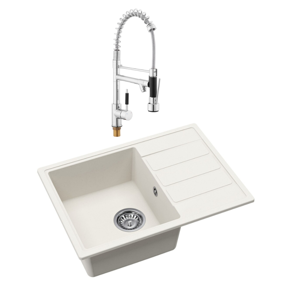Swiss Aqua Technologies 62x44 cm évier avec égouttoir réversible en granite à encastrer + mitigeur à bras pivotant, 2 jets, blanc (SATSINKGE2W-SET2)