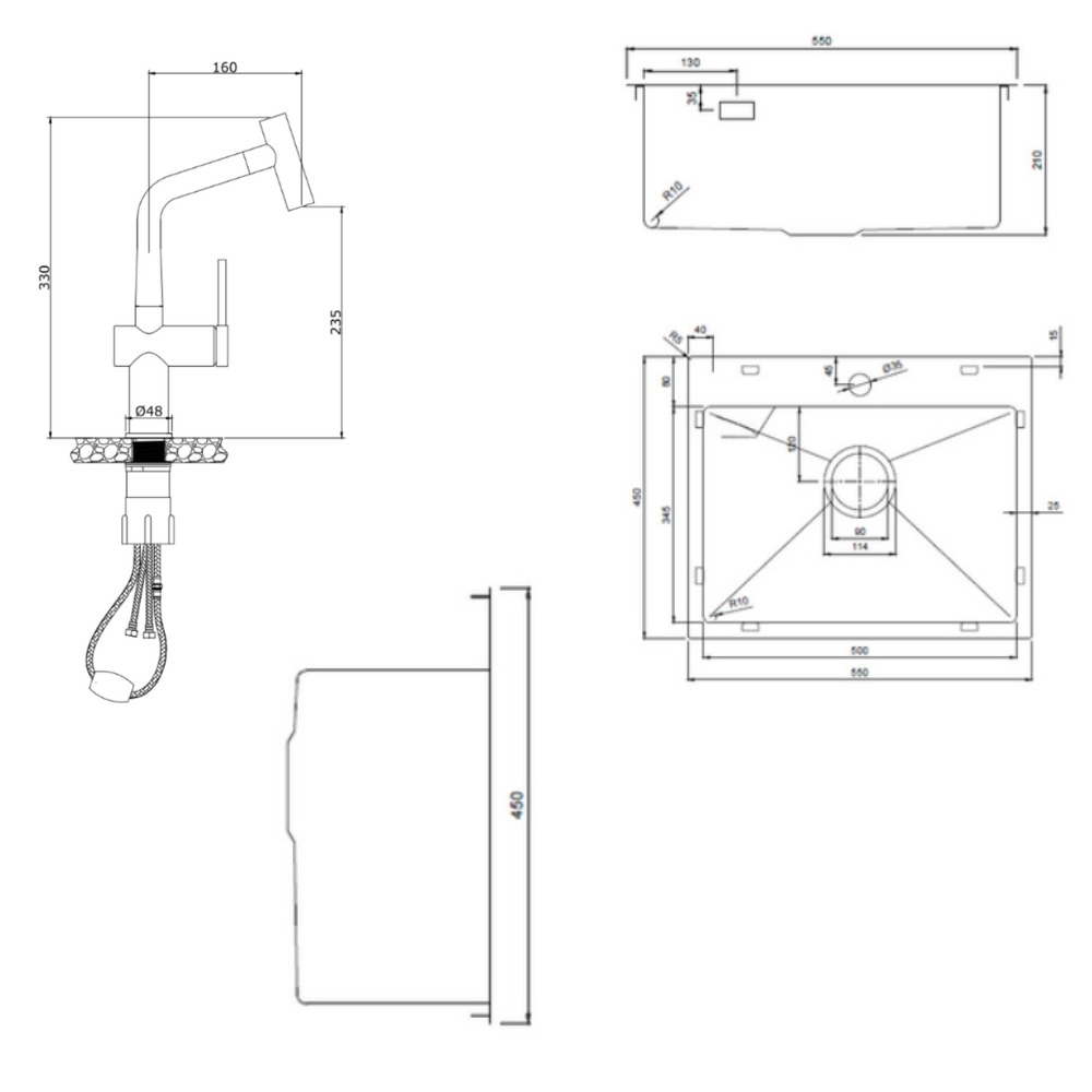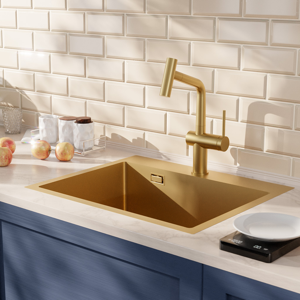 Caractéristiques de l'évier encastrable 55x45x21 cm en inox 304, 1 bac + mitigeur d'évier à levier en acier inoxydable avec douchette extractible, monotrou, Ceramia Timeless, or brossé (TMLKST-5545BG-M1) :