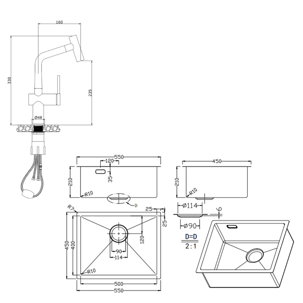 Caractéristiques de l'évier sous plan 55x45x21 cm en inox 304, 1 bac + mitigeur d'évier à levier en acier inoxydable avec douchette extractible, monotrou, Ceramia Timeless, or brossé (TMLKSU-5545BG-M1) :