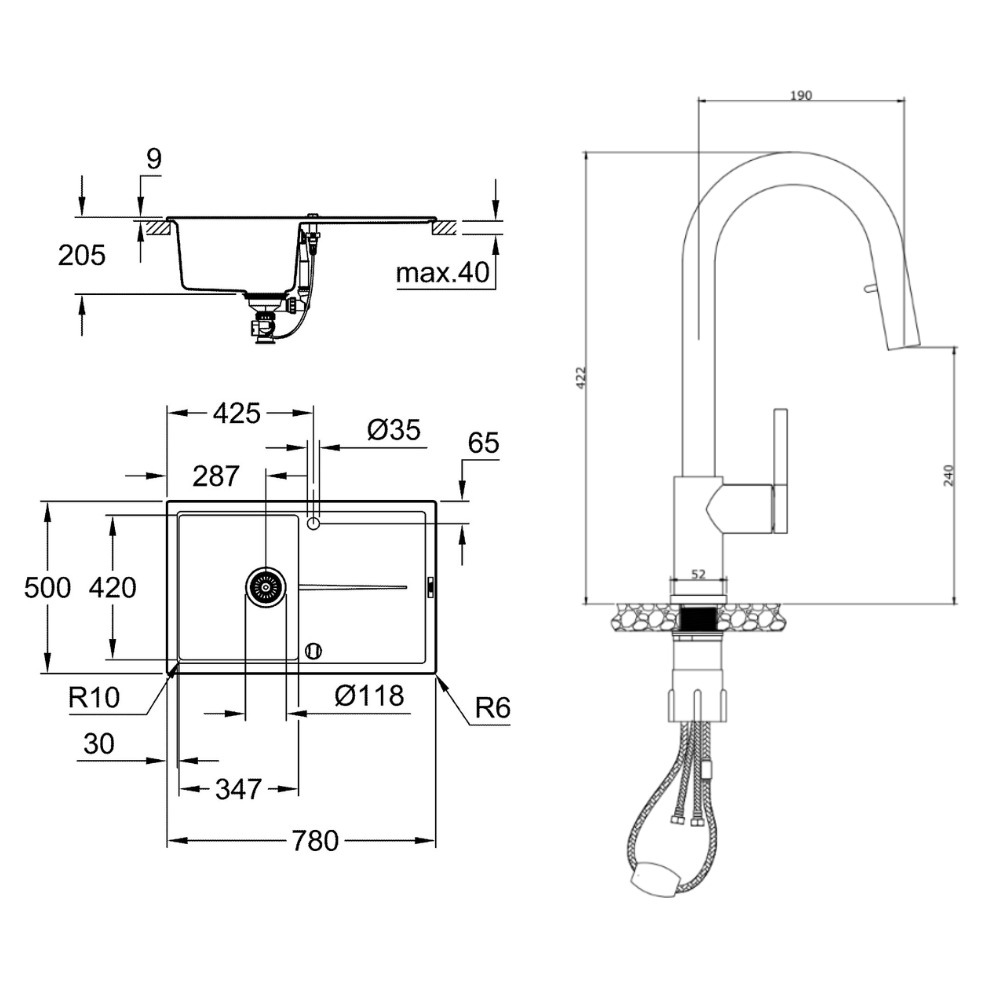 Caractéristiques de l'évier en quartz composite avec égouttoir réversible 780x500 mm Grohe K400 + Ceramia Timeless mitigeur (G31639TML2BGM-SET) :