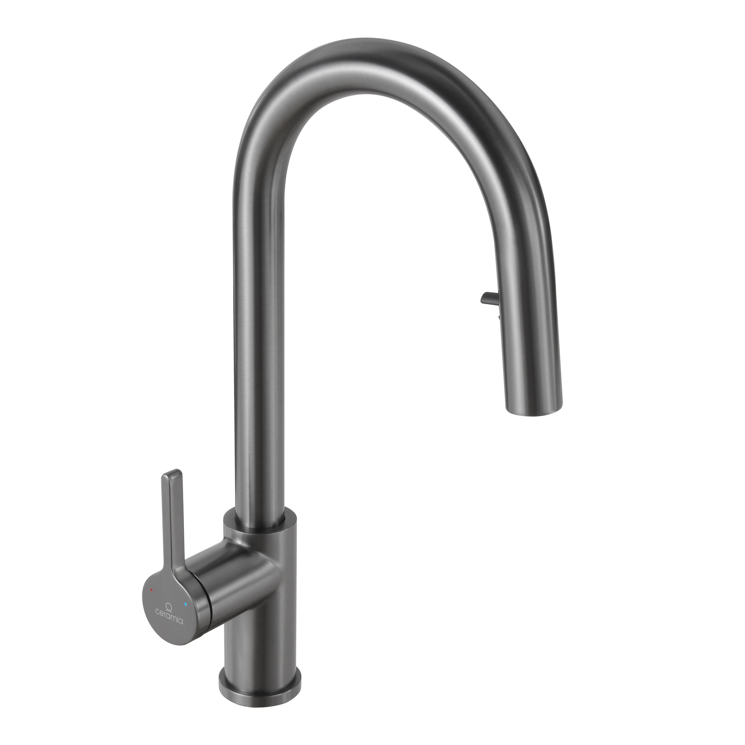 - Ceramia Timeless mitigeur d'évier à levier en acier inoxydable avec douchette extractible, monotrou, gun metal brossé (TMLKF285BGM)