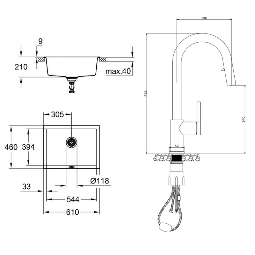 Caractéristiques de l'évier composite Grohe K700U + Ceramia Timeless mitigeur (G31655TML2BGM-SET) :