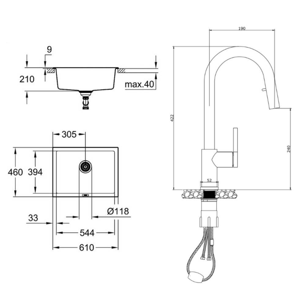 Caractéristiques de l'évier composite Grohe K700U+ Ceramia Timeless mitigeur (G31655TML2BM-SET) :