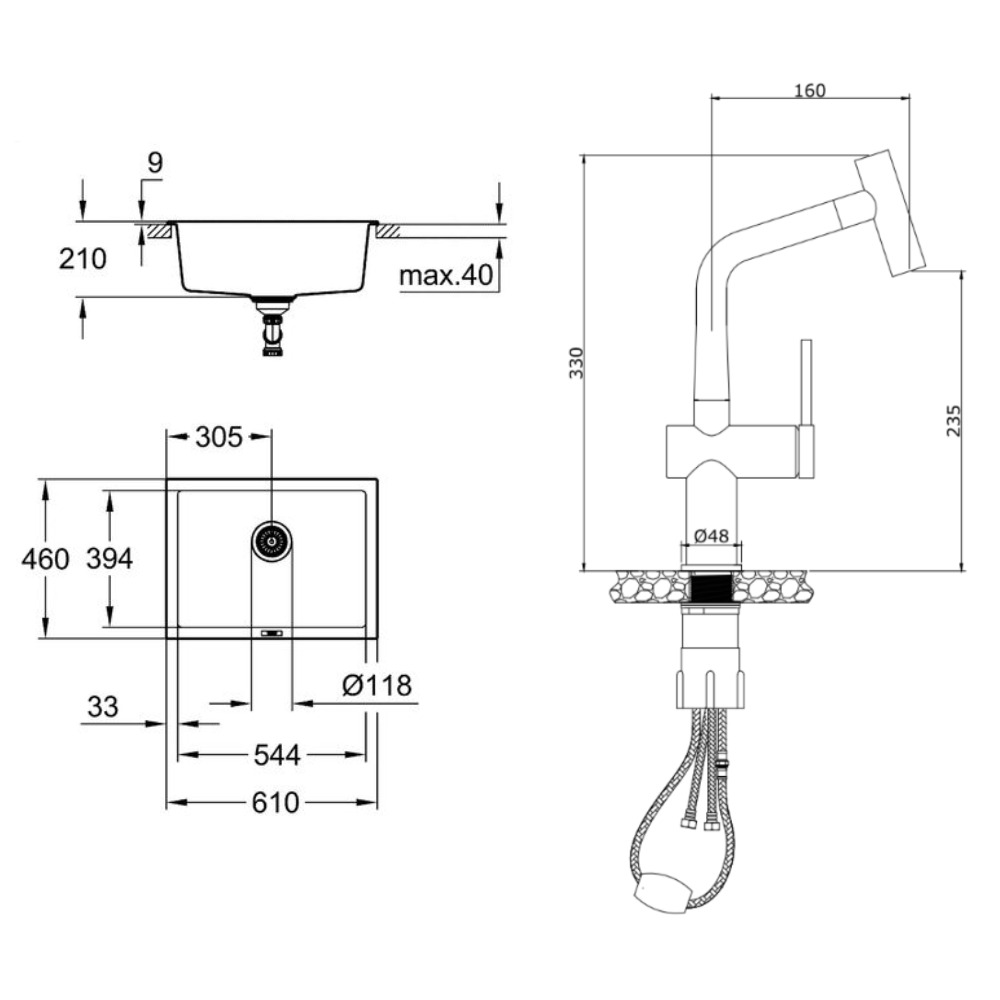 Caractéristiques de l'évier composite Grohe K700U + Ceramia Timeless mitigeur (G31655TML1BCP-SET) :