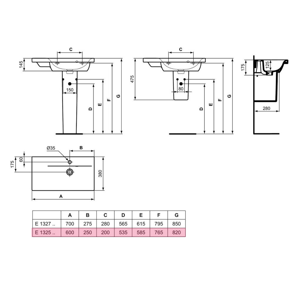 Caractéristiques du Connect Space Lavabo 600 x 175 x 380 mm, blanc (E1325MA):