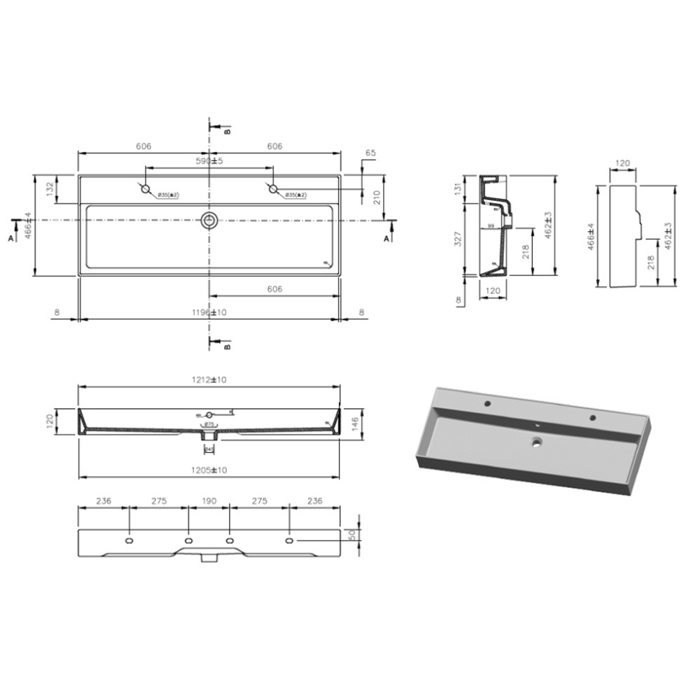 • Dimensions de la vasque : 121,4 x 12 x 46,9