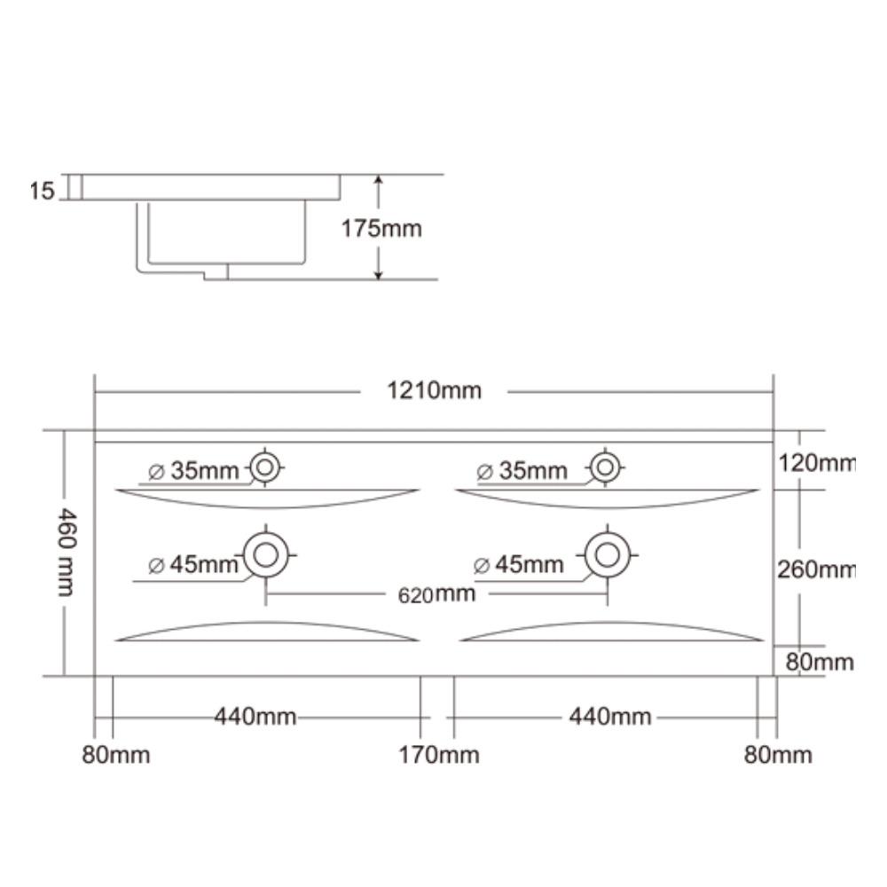 Caractéristiques de la double vasque en céramique 121x46x17,5 cm, 2 trous pour robinetterie, Naturel Modena, blanc (M2N12046) :