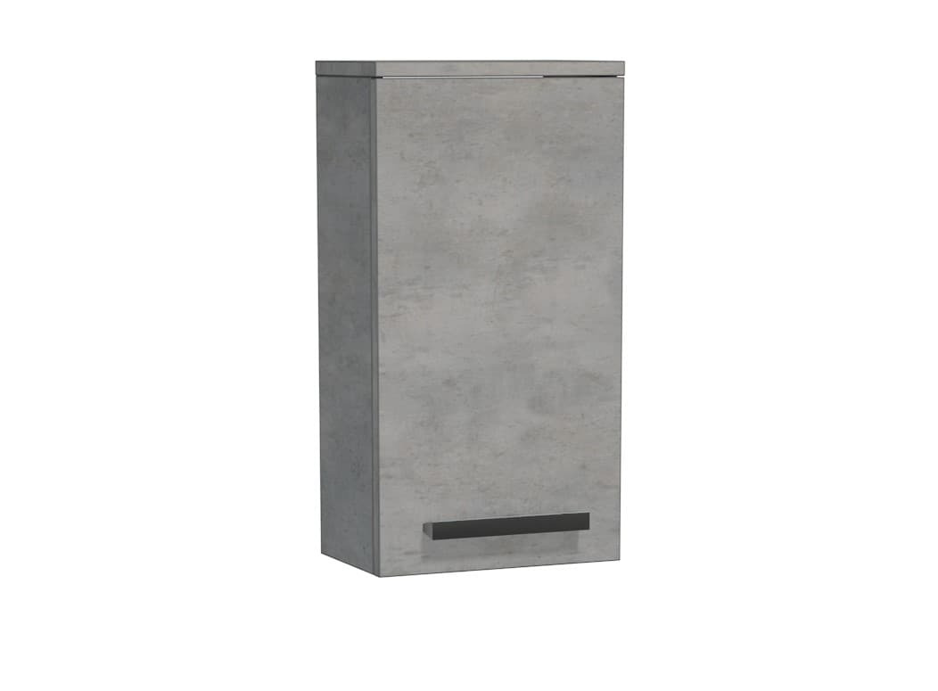 Meuble de salle de bain suspendu, bas en imitation béton, mesurant 32,5x63x20 cm. Surface stratifiée. Avec fermeture lente. La porte s’ouvre à droite et à gauche.