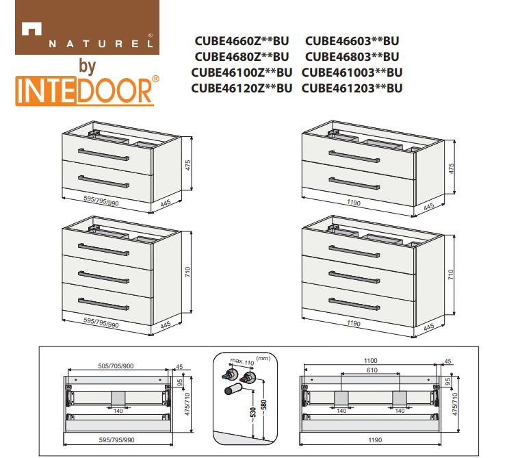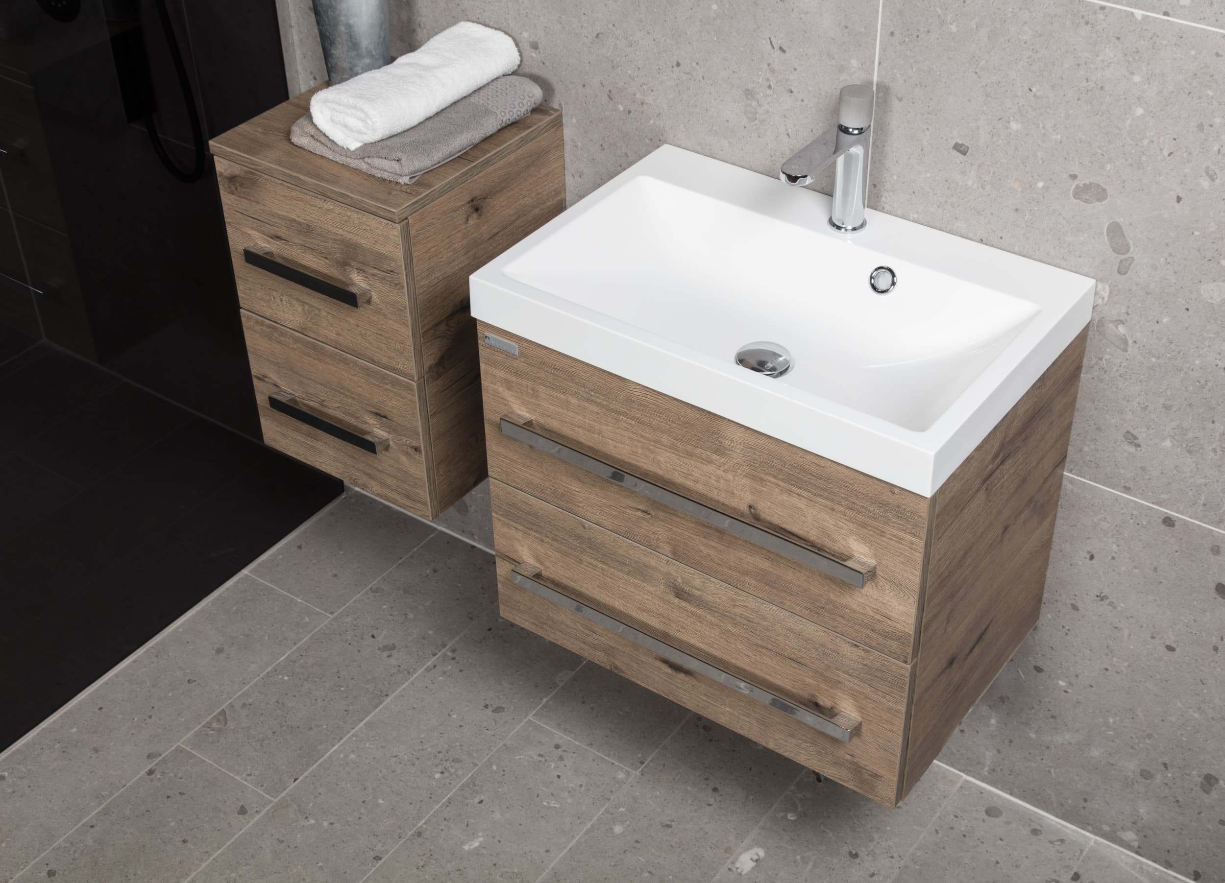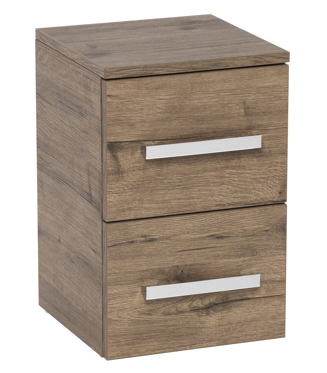 Meuble bas pratique pour la salle de bain avec deux tiroirs qui offrent un espace de rangement pour vos accessoires d'hygiène. Les tiroirs ont une extension totale avec butée.