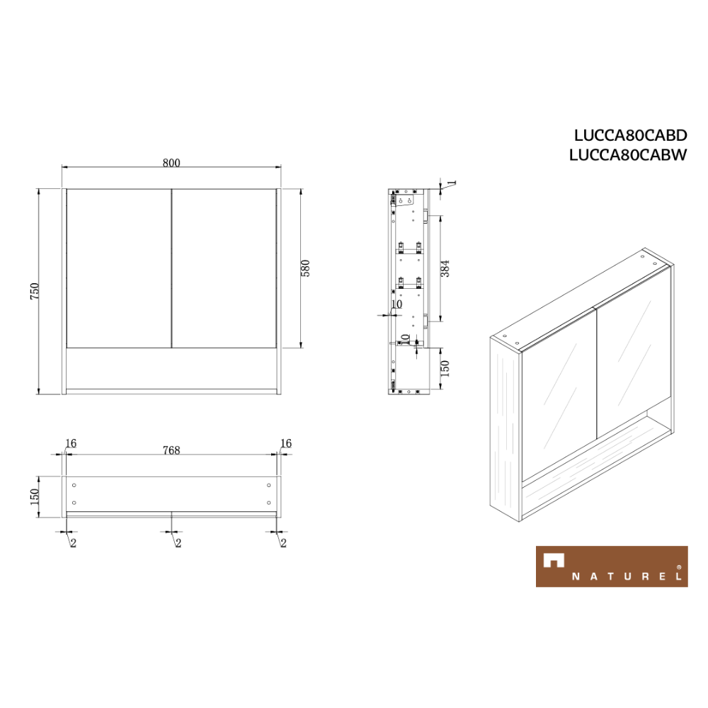 Caractéristiques de l'armoire de toilette assemblée 80x75 cm, stratifié, 4 étagères, miroir blanc, Naturel Lucca (LUCCA80CABW) :