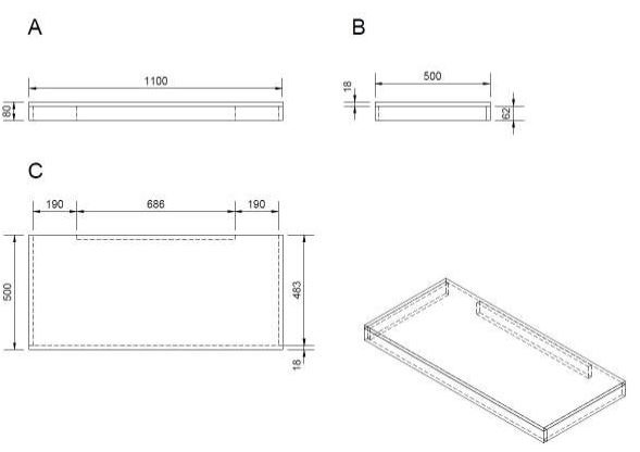 Plaque sous le lavabo. Le trou pour le vidage du lavabo doit être réalisé en fonction de la cuvette achetée. Les supports pour accrocher la planche au mur ne sont pas inclus dans la livraison