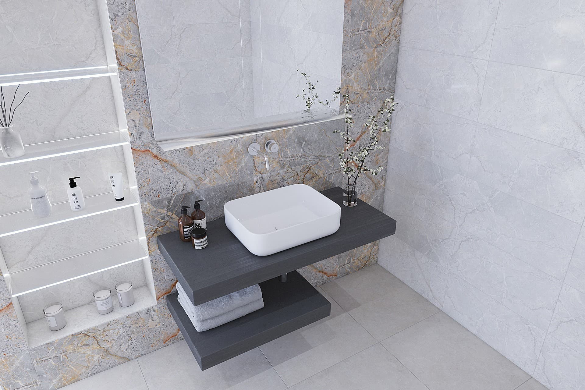 Plaque sous le lavabo. Le trou pour le vidage du lavabo doit être réalisé en fonction de la cuvette achetée. Les supports pour accrocher la planche au mur ne sont pas inclus dans la livraison