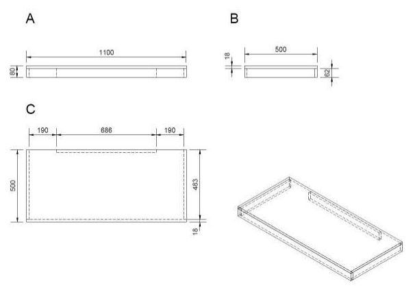 Plaque sous le lavabo. Le trou pour le vidage du lavabo doit être réalisé en fonction de la cuvette achetée. Les supports pour accrocher la planche au mur ne sont pas inclus dans la livraison. Les supports appropriés sont KONZOLEH et KONZOLEP.