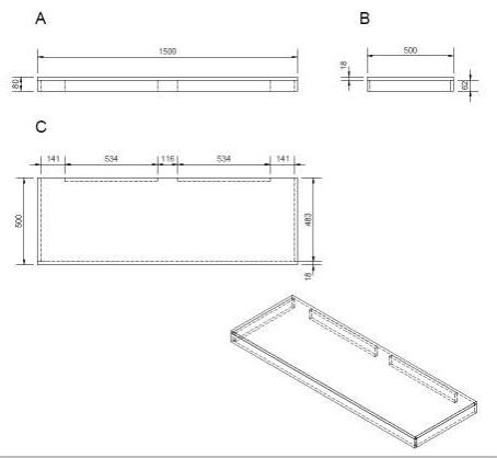 Plaque sous le lavabo. Le trou pour le vidage du lavabo doit être réalisé en fonction de la cuvette achetée. Les supports pour accrocher la planche au mur ne sont pas inclus dans la livraison. Les supports appropriés sont KONZOLEH et KONZOLEP.