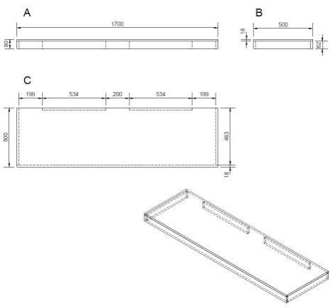Plaque sous le lavabo. Le trou pour le vidage du lavabo doit être réalisé en fonction de la cuvette achetée. Les supports pour accrocher la planche au mur ne sont pas inclus dans la livraison