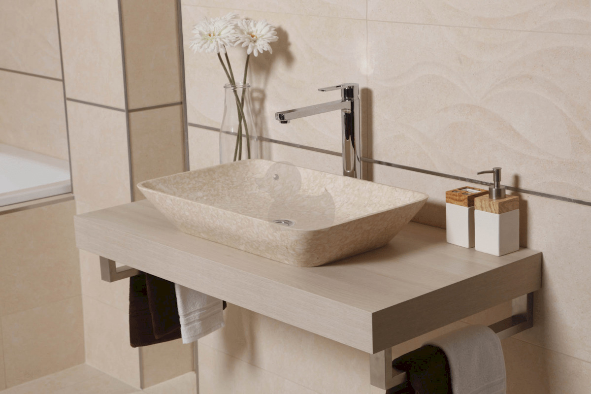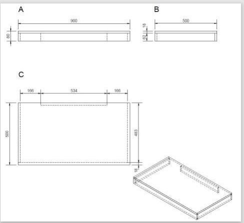 Plaque sous le lavabo. Le trou pour le vidage du lavabo doit être réalisé en fonction de la cuvette achetée. Les supports pour accrocher la planche au mur ne sont pas inclus dans la livraison