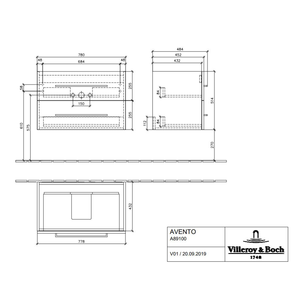 Villeroy & Boch Meuble sous plan Avento, 2 tiroirs sur rails, 776 x 514 x 484 mm, Nordic Oak (A89100VJ)