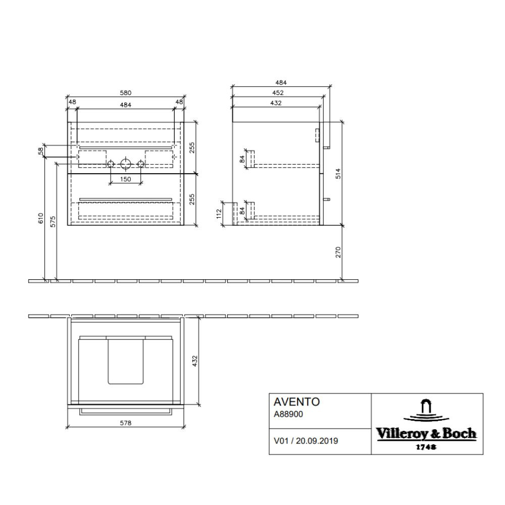 Villeroy & Boch Meuble sous plan Avento, 2 tiroirs sur rails, 580 x 514 x 484 mm, Crystal Black (A88900B3)