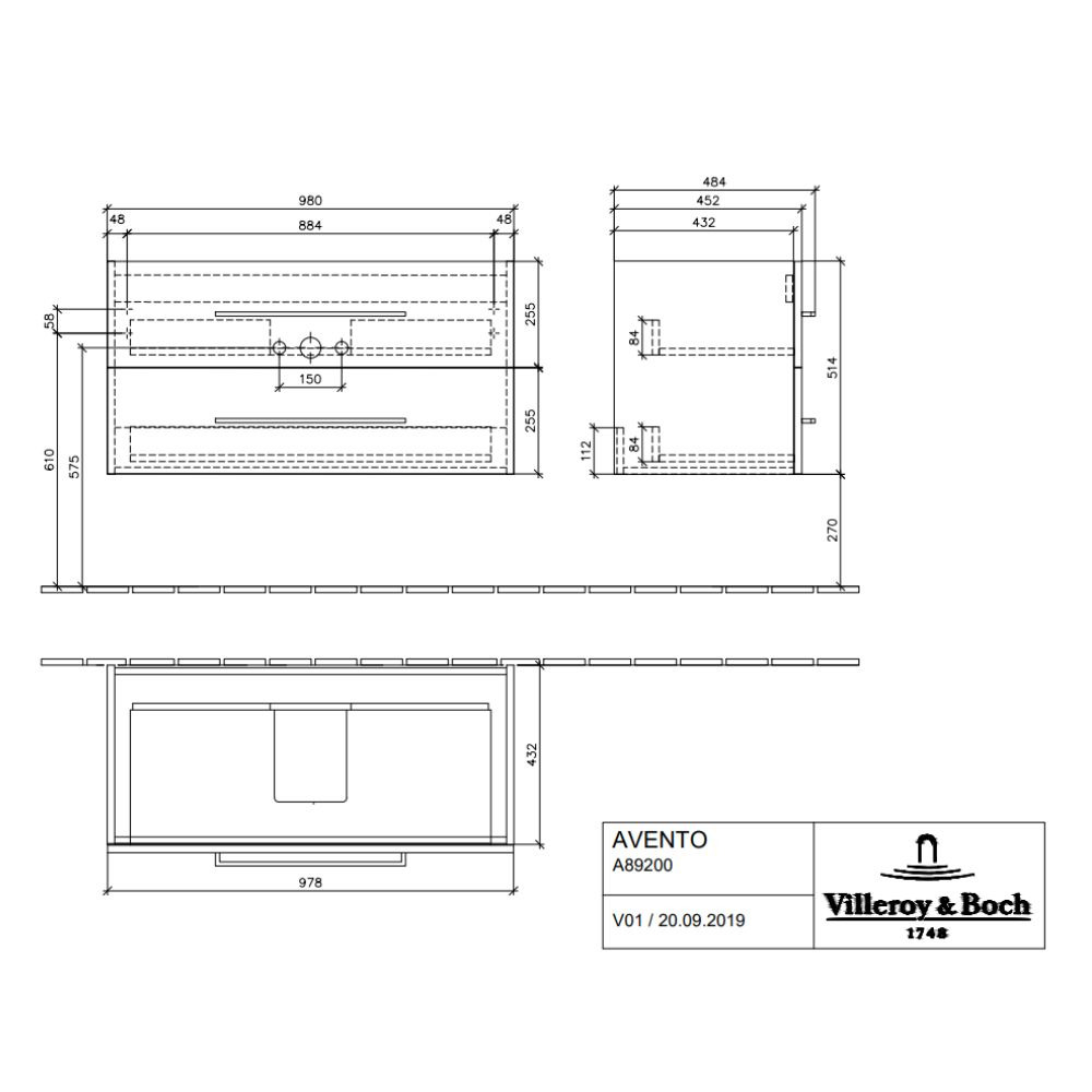Villeroy & Boch Meuble sous plan Avento, 2 tiroirs sur rails, 980 x 514 x 484 mm, Crystal Black (A89200B3)