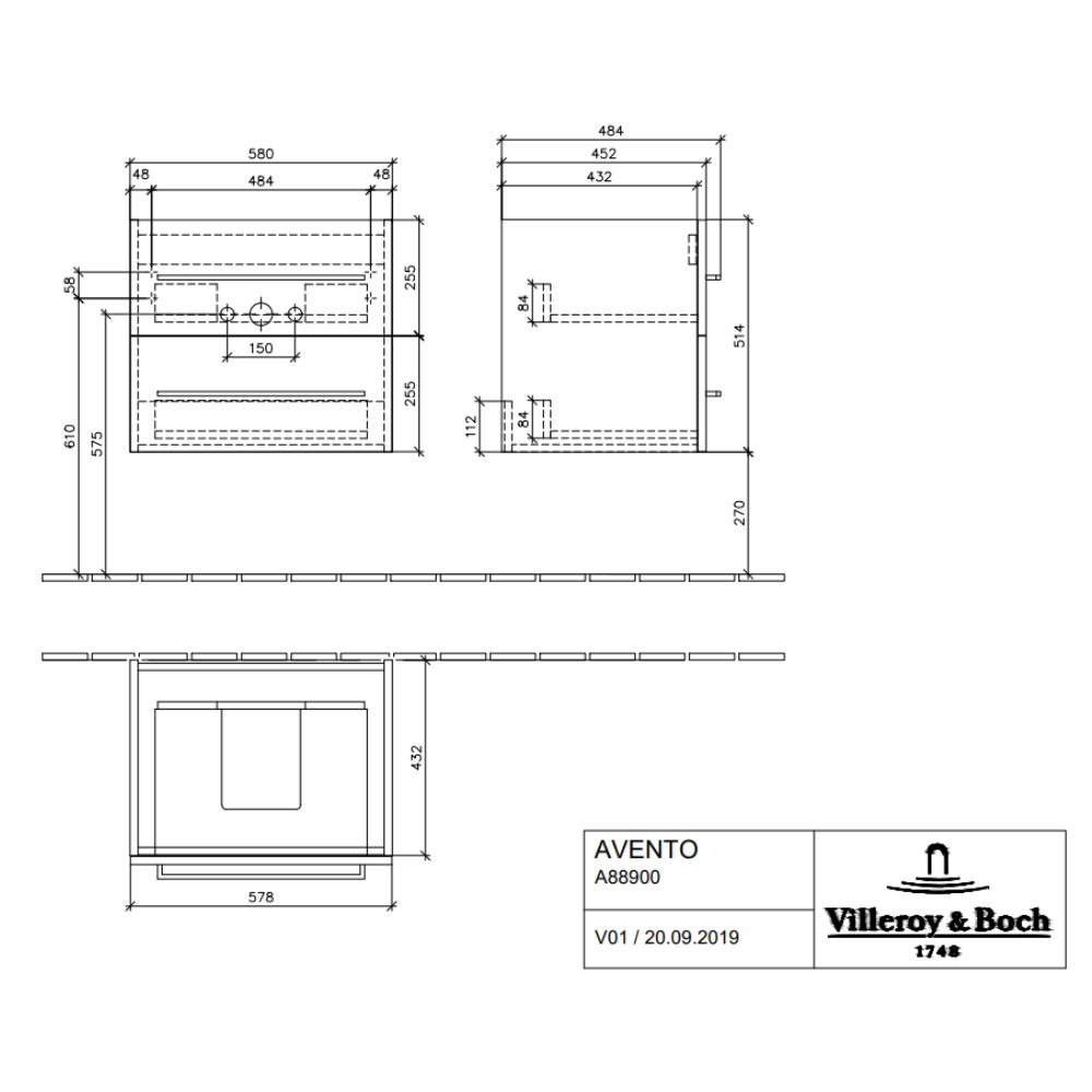 Villeroy & Boch Meuble sous plan Avento, 2 tiroirs sur rails, 576 x 514 x 484 mm, Oak Kansas (A88900RH)