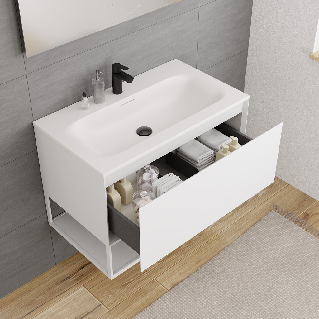 Idéal pour ceux qui recherchent un meuble de salle de bain avec tiroir alliant design contemporain et fonctionnalité.