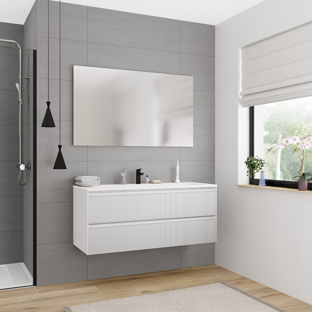 Apportez une légèreté naturelle à votre salle de bain avec le meuble Ceramia 120 cm en blanc cassé, alliant esthétique épurée et fonctionnalité moderne.